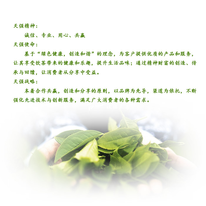隨著中國(guó)茶葉的不斷發(fā)展,我們將進(jìn)一步開發(fā)新產(chǎn)品,為用戶提供優(yōu)良的服務(wù)。公司始終堅(jiān)持“以質(zhì)量求生存,以市場(chǎng)求發(fā)展,以顧客需求為己任”的企業(yè)宗旨,致力于中國(guó)綠色食品、有機(jī)食品行業(yè)的發(fā)展。天強(qiáng)經(jīng)貿(mào)有限公司竭誠(chéng)歡迎國(guó)內(nèi)外客戶和朋友光臨指導(dǎo),共圖發(fā)展!